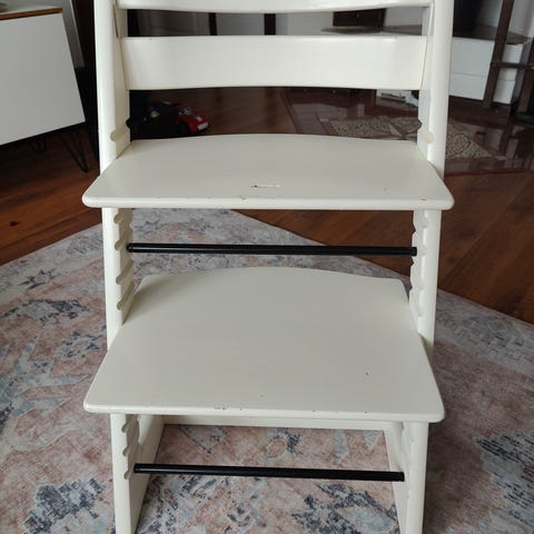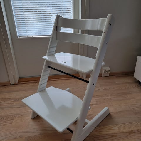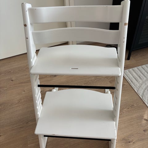 Stokke Tripp Trapp tuoli. Kohtalaisen siisti, mutta naarmuja ja kolhuja on.