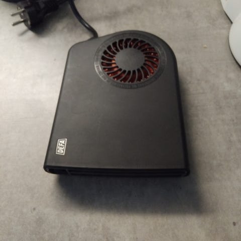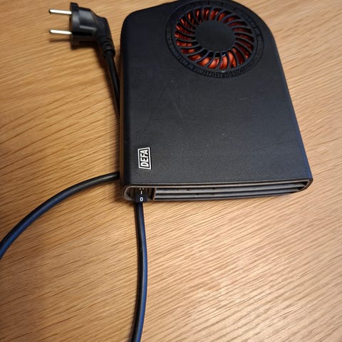 Toimiva Defan lämmitin. 2100 w. Ei kiinnityslevyä, mutta löytyy muutamalla eurolla tarvikeliikkeistä.