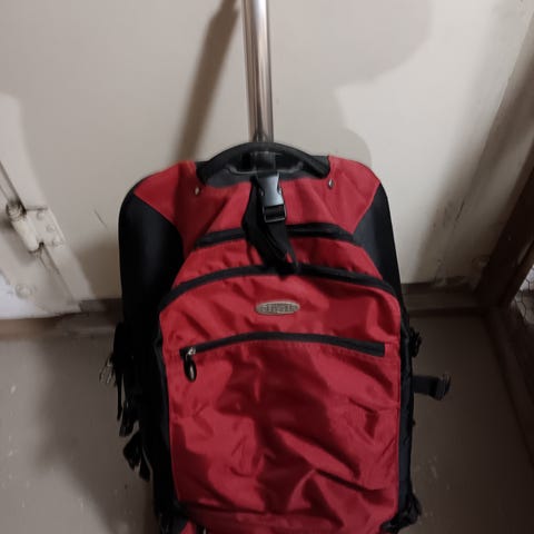 Vanha käyttökelpoinen vetolaukku jossa skottiruutua