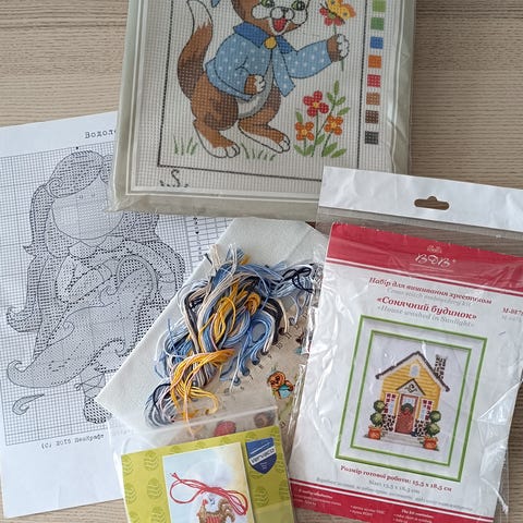 Ristipistopakkauksia ja kirjontalankoja sekalaista. Kuvissa useita ristipistomalleja, valmiiksi pujotettuja kirjontalankoja sekä erillisiä lankapusseja eri väreissä. Mukana myös kirjontakankaita ja ohjelehtisiä. Sopii ristipisto- ja muuhun kirjontatyöhön sekä askarteluun. Tarkempi sisältö ja lankamäärät eivät ole yksilöityjä, vaan kokonaisuus myydään yhtenä sekasettinä.