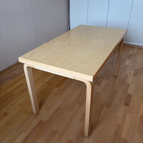 Artek Alvar Aalto sohva-/lastenpöytä 1980- luvulta, jossa suorakulmainen valkoinen pöytälevy ja koivuvanerinen reunalista sekä jalat. Pöydän muoto ja materiaalit sopivat ruokapöydäksi tai työpöydäksi useisiin sisustuksiin. Pöytälevy on ylhäältä valkoinen, ja alapuoli on puupintainen. Jalusta ja reunat ovat vaaleaa koivua, joka on tyypillinen materiaali Artek Aallon pöydissä.