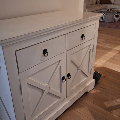 Valkoinen lipasto, jossa kaksi vetolaatikkoa ja kaksi ovea. Kummankin oven takana kaksi hyllyä.
