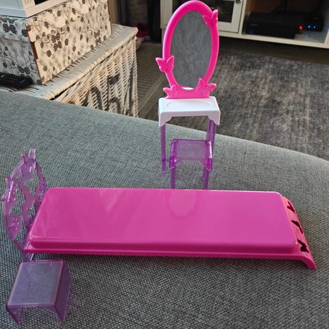Myydään lastenhuone-setti Barbie-leikkeihin.