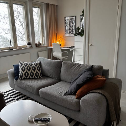 Yleisilmeeltään yhä siisti Askon vaaleanharmaa sohva metallijaloilla. Sohvaa on aika ajoin putsattu tekstiilipesurilla ja kankaasta lähtee hyvin tahrat. Yhdessä istuintyynyssä jälleen kahvitahra joka yritetty putsata vain harsolla ja hellävaraisella pesuaineella, ei tekstiilipesurilla (katso viimeinen kuva).