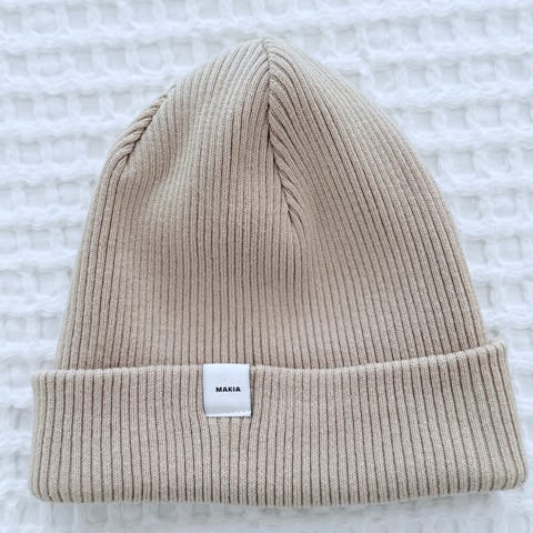 Makia pipo, one size -koko. Punainen, ribbineulottu malli. Materiaali puuvillaa. Sopii aikuiselle, joustava koko. Makian logomerkki edessä käännetyssä reunassa.