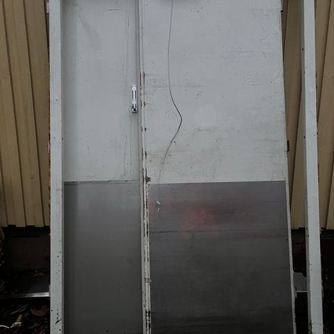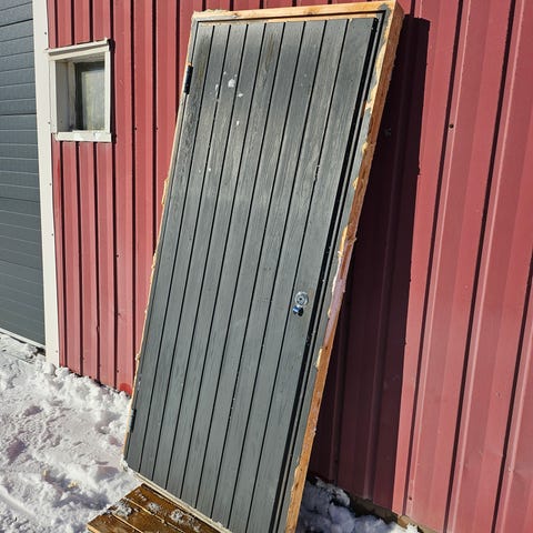 Erittäin hyvä raksa-ovi. Puhallin toimii. Kulmassa valmiiksi tehty reikä sähköjohdolle, mikä helpottaa käyttöä työmaalla.