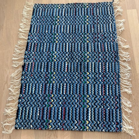 Pieni käsin kudottu räsymatto. Pituus 60cm leveys 83cm.