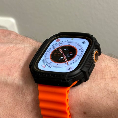 Apple Watch Ultra älykello oranssilla Alpine Loop rannekkeella. 49mm virheetön kosketusnäyttö.