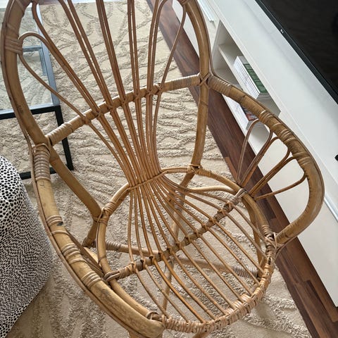 1970-luvun rottinkinen nojatuoli. On kulumia ja tummentumia, ja punosnaruja paikoin irronnut. Tukirakenteet kuitenkin kunnossa ja kestää kyllä oikein hyvin istumista. Päälle voi laittaa taljan tai pehmustetyynyt. Ei ole enää priimaa, mutta laadukkaasti tehty ja asiansa ajaa. Vain nouto