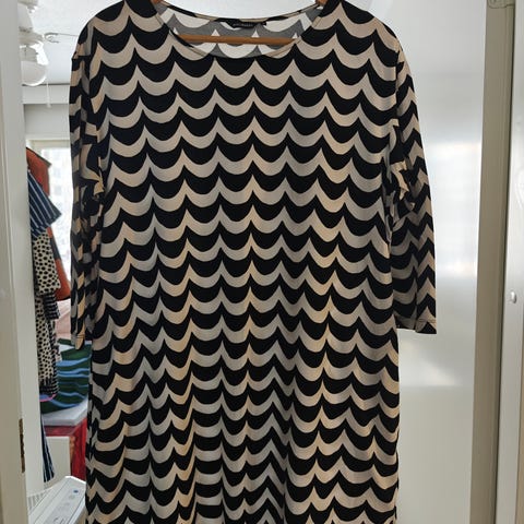 Marimekko pusero naisille, koko XL. Valkoinen puuvillainen pusero, jossa musta kirjainkuosi kauttaaltaan. Pitkät hihat ja pyöreä pääntie. Materiaali 100 % puuvillaa. Sopii arkipukeutumiseen ja kerrospukeutumiseen.