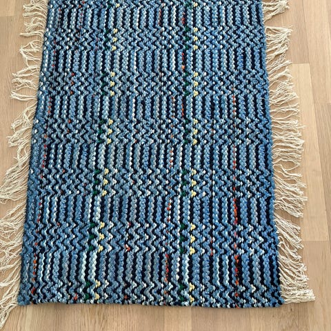 Käyttämätön pieni käsinkudottu räsymatto. Pituus 55cm leveys 84cm.