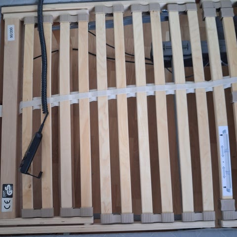 Maskusta ostettu sähkösäätöinen sänky, jossa kaksiosainen sälepohja. Molemmat puolet ovat erikseen säädettävissä kaukosäätimellä, jolloin pää- ja jalkopäätä voi nostaa ja laskea. Rungossa ja säleissä on puumateriaali, ja sängyssä on pyöreät puujalat metallisilla jalkalevyillä. Tuote myydään ilman patjoja, kuvissa näkyy ainoastaan sängyn runko, sälepohjat, jalat ja kaukosäädin.