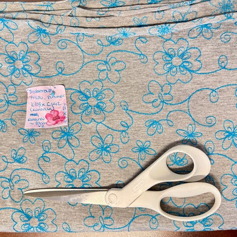Puuvilla-trikoo -pala jälkiaiheella. Kaunis vaaleansininen pohja, mitä on hankala saada kuvaan. Voin halutessa ottaa lisäkuvia.