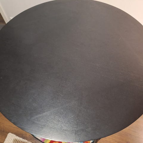 Musta pyöreä ruokapöytä, 99cm halkaisijaltaan, puunväriset irroitettavat jalat. Painava, niin olisiko täyspuinen. Kunto käytetty hyvä.