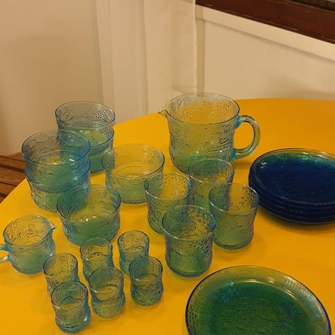 Nuutajärven Fauna, kannu ja kuusi juomalasia. Väri ruskea, ollut tuotannossa 1973-1977.