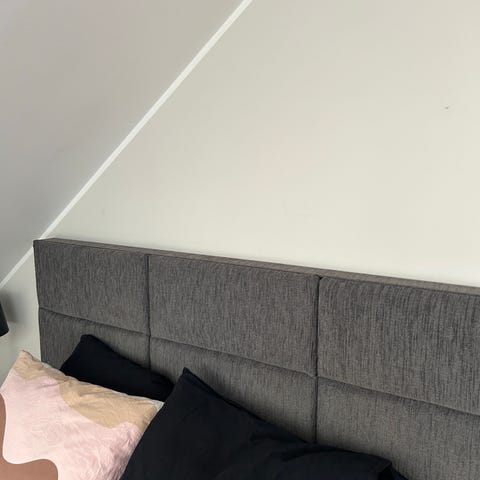 Ellokselta tilattu beige kankainen sängynpääty 160cm sänkyyn. Takana kaksi metallikoukkua, jolla päädyn saa kiinnitettyä seinään. Pysyy myös patjan päällä ilman kiinnityksiä.