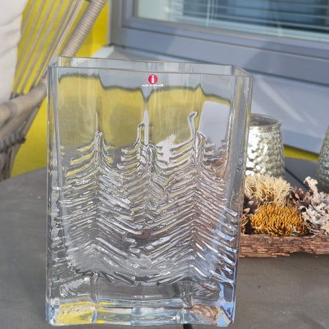 Iittala lasimaljakko, kirkas lasi. Kartionmuotoinen maljakko, jossa on ulkopinnassa vaakasuuntaiset, uramaiset koristelut.