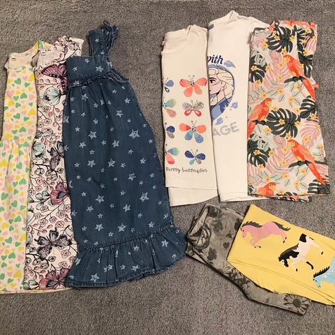 Siistikuntoinen vaatepaketti, jossa 6 pitkähihaista paitaa, 4 lyhythihaista paitaa ja 4 housut. Kokomerkintä vaihtelee 110-128 cm, mutta nämä ovat pääasiassa olleet käytössä kokoa 110/116 käyttävällä lapsella, joku vaate saattanut mennä myös pidempään. Osa on uudenveroisia ja osassa on jo enemmän nukkaa ja pesuhaitua. Vaaleanpunaisen paidan Frozen-printissä paljon kulumaa. Viat huomioitu hinnassa. Merkkeinä h&m, mywear, ciraf, lupilu, guppy. Meillä ei ole lemmikkejä. Hajusteeton pyykinpesuaine käytössä.