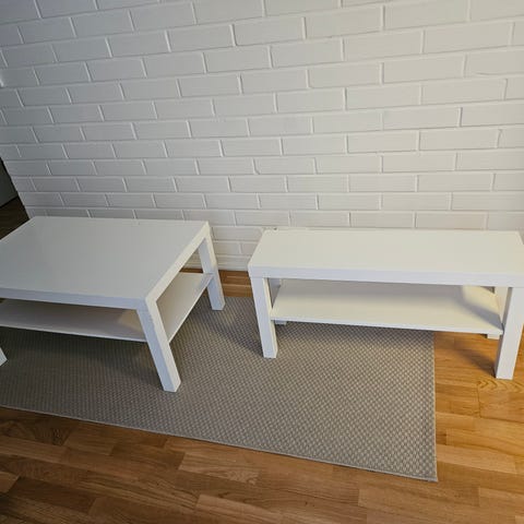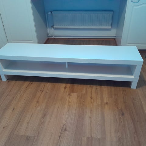 Hyväkuntoinen Ikean Lack TV-taso. Tasossa pieni, lähes huomaamaton, osuma (kuva).
