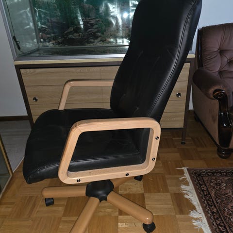 Kuin uusi tekonahkainen työtuoli. Leveys noin 55 cm, syvyys noin 55 cm. Istuinkorkeus säädettävissä, keinuominaisuus. Tuoli on niin vähän käytetty, että renkaat ei vielä rullaa soljuvasti. Ostettu Jyskistä.