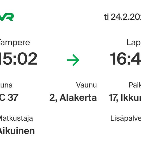 junalippu Tampere–Helsinki su 22.2 klo 17