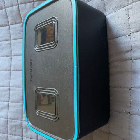Tupperware säilytysrasia, jossa läpinäkyvä astia ja tummansininen kansi. Soveltuu esimerkiksi elintarvikkeiden tai pienten tavaroiden säilytykseen keittiössä. Materiaali muovia. Pyöreä malli, irrotettava kansi. Vetoisuus 1,2 l