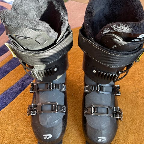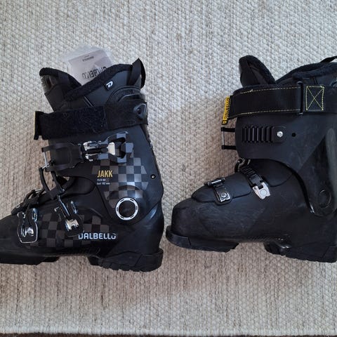 Dalbello laskettelumonot. Monot ovat mustat, joissa on harmaita ja vaaleita yksityiskohtia. Kengissä on useita solkia ja tarrakiristys varressa istuvuuden säätöön. Sisäkenkä on pehmustettu ja karvavuorinen lisälämpöä varten. Pohjassa on kumiset kulutuspinnat kävelyä varten. Soveltuvat rinnelasketteluun.