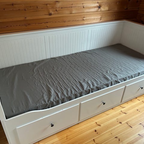 Metallirunkoinen päivävuode, jossa harmaanvihreä samettimainen kangas. Patjan paksuus 13 cm. Mukana makkaratyyny. Yleisilme siisti, pientä käytön jälkeä. Toiminut meillä varavuoteenakin, mutta nyt tarvitaan tilalle levitettävä versio.