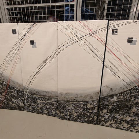 Abstrakti taulutriptyykki, jossa on kolme erillistä paneelia. Jokaisessa paneelissa on musta tausta ja keltaisia abstrakteja maalipintoja, jotka muodostavat yhtenäisen kokonaisuuden. Sopii seinälle esimerkiksi olohuoneeseen tai muuhun sisätilaan. Materiaalina akryylimaali alumiinikomposiitille. Kiiltävä pinta heijastaa valoa. Myydään kolmen osan sarjana. Keskimmäisessä levyssä pieni kokoero.
