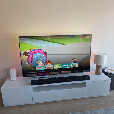Kiiltovalkoinen klassisen kaunis TV-taso, joka on alun perin ostettu Vepsäläiseltä.