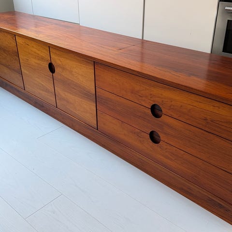 Kaunis pitkä ja matala teak-hylly Pertti Salmen suunnittelemasta Vilka Optimus sarjasta 70-luvulta. Toimii myös tv tasona.