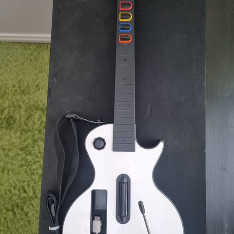 Kuvan mukainen täysin toimiva guitar hero kitara wii konsolille. Toiminta testattu. Hihna ja ohjainkotelon takakansi puuttuu mutta ei vaikuta toimintaan. Toimii myös tietokoneella esim clone hero pelissä erillisellä usb adapterilla (Retrocult V3) jonka voin tarvittaessa myydä mukaan 20e lisähintaan. Postitus onnistuu tarvittaessa.