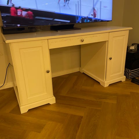 Pöytäpinta kaipaa remonttia kuten kuvasta hoksaa. Pöytä ja laatikosto ei ole kiinnitetty toisiinsa.