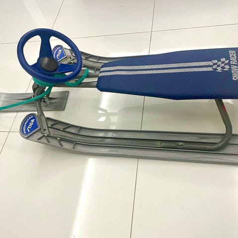 Stiga rattikelkka lapsille. Väri musta ja keltainen. Kelkkassa on ohjauspyörä, jarru ja vetonaru muovisella kahvalla. Alkuperäinen naru ja kahva rikkoutuneet, mutta korvattu kotitekoisella. Runko on metallia ja sukset sekä istuin muovia. Vaijeti ruostunut, ei haittaa käyttöä.