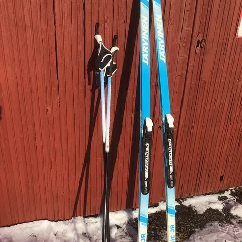 Ostan perinteisen tyylin sukset, sauvat ja monot 170-senttiselle naiselle. Monot kokoa 40.