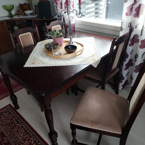 Ruokailuryhmä 4 tuolilla. Pikkuvikaa jalassa ja tuolin sivussa. Vain nouto.