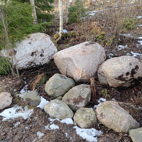 Löytyy myös tavallisia, erilaisia ja kokoisia luonnonkiviä, isoimmat n. 150 cm, pienimmät n. 40 cm halkaisijaltaan.