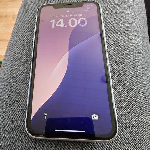 Apple iPhone älypuhelin, tallennustila 64 GB. Puhelimessa on kosketusnäyttö ja etupaneelissa kotipainike. Väri vaalea/valkoinen. Kuvatun puhelimen näytössä ja reunassa näkyy halkeamia. Mukana vaalea marmorikuvioinen suojakuori. Soveltuu peruskäyttöön, kuten puheluihin, viestintään ja sovellusten käyttöön, kunhan laitteen tekninen kunto vastaa ostajan tarpeita. Akku