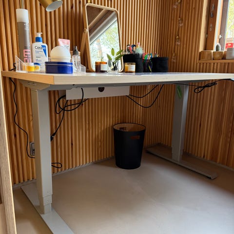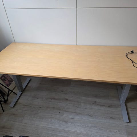 Tämä laadukad työpöytä on suunniteltu toimistokäyttöön, ja sen korkeutta voi muuttaa nappia painamalla.