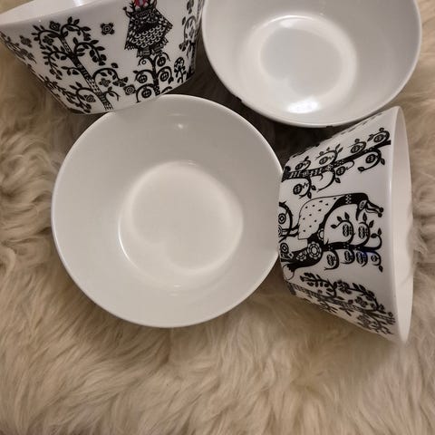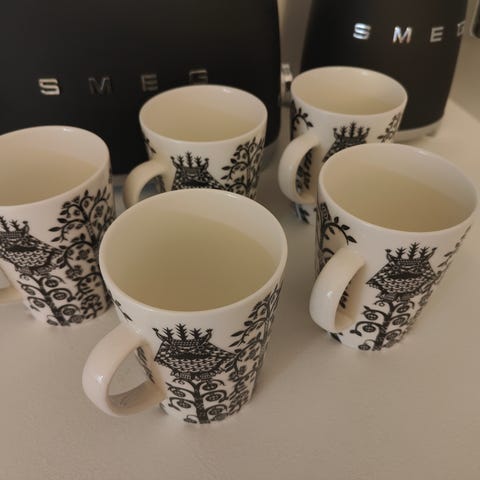Iittala Taika mukit. Kuviollisia posliinimukeja useissa väreissä, mm. sininen, valkoinen ja mustavalkoinen. Sopivat arki- ja kahvimukeiksi keittiöön. Mukeissa on korva ja ne ovat pinottavia. Myydään kuvissa näkyvänä settinä.