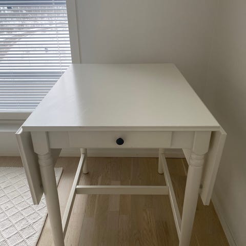 Kätevä ja vähän tilaa vievä valkoinen ikean klaffipöytä. Hyvässä kunnossa, nouto Alppilasta maaliskuun puolivälissä.