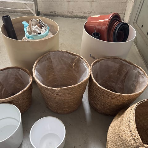 Erä istutusruukkuja ja aluslautasia. Mukana useita eri kokoja ja malleja, sekä muovisia että terrakotta-ruukkuja. Osa ruukuista on pyöreitä ja osa kulmikkaita, sekä sisä- että ulkokäyttöön sopivia. Mukaan myös muovinen kastelukannu.