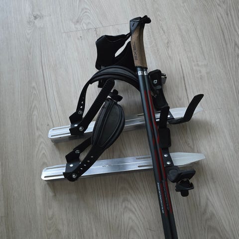48 cm pitkät retkiluistimet. Siniseksi anodisoitu pinta. Kiinnitetään suoraan tavallisiin kenkiin, esim. vaelluskenkiin tai tukeviin talvikenkiin.