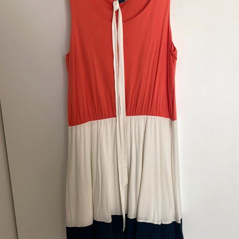 Mekko on valmistettu puuvillasta ja siinä on sinivalkoinen leveäraita kuvio. Mallissa on pyöreä pääntie ja noin 3/4-pituiset hihat. Sopii arkeen ja vapaa-aikaan.