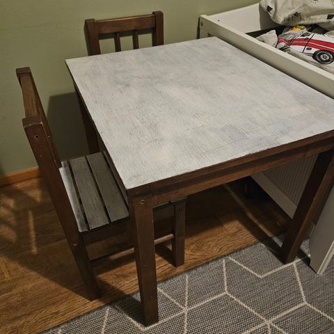 IKEA lasten työpöytä ja työtuoli -setti. Työpöydässä on valkoinen suorakulmainen pöytätaso, yksi laatikko ja kaappi säilytystä varten. Pöydän mitat näkyvät ilmoituksen kuvissa (leveys noin 105 cm, syvyys noin 50 cm, korkeus noin 75 cm). Pöydän kannessa on läpivienti johdoille.