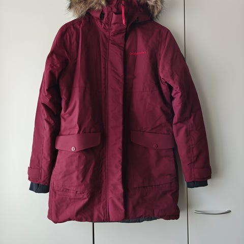 Myydään laadukas lämmin punainen talvitakki kokoa 36. Toisessa hihassa hieman kulumia, jotka eivät vaikuta takin käytettävyyteen eivätkä juuri näy (katso viimeinen kuva).