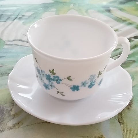 Acropal Ranska Veronika (Myositis) Kahvikuppisarja, jossa on kuusi valkoista kuppia ja kuusi aluslautasta, erittäin hyvässä kunnossa. Pehmeää valkoista pohjaa korostavat kauniisti hienovaraiset siniset kukat ja vihreät lehdet, jotka luovat ajattoman ja elegantin ilmeen. Lisää ripaus vintage-charmia tee- tai kahvihetkiisi näillä kauniilla Arcopal Francen kupeilla ja lautasilla. Sisältää yhteensä 12 osaa (6 kuppia ja 6 lautasta) Veronica-sarjasta, joka tunnetaan myös nimellä Myosotis ihastuttavan sinisen kukka-aiheensa vuoksi. Mitat: