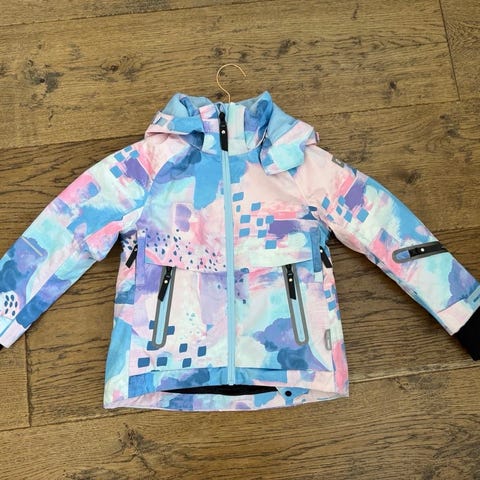 Reimatec vaaleanpunainen laskettelutakki . 110. Meillä meni lonessa koossa. Ohut vuori, sopi kylmemmälle kelille vanutakin kanssa, kuitenkin hyvä tuulen suojaavuus. Käytetty vain laskettelussa. Pinttynyttä likaa on, kuitenkin yleisilme siisti. Pesu jää ostajalle.