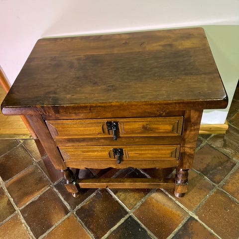 Vihreä yöpöytä laatikolla. Pöydässä on yksi vetolaatikko, jossa on pyöreä metallinen vedin, sekä avoin hyllyosa laatikon alla. Materiaalina on maalattu puu, laatikon sisäosa on vaaleaa puuta ja takalevy kuitulevyä. Sopii esimerkiksi makuuhuoneen yöpöydäksi tai pienenä sivupöytänä olohuoneeseen.