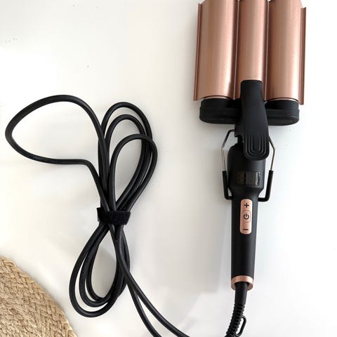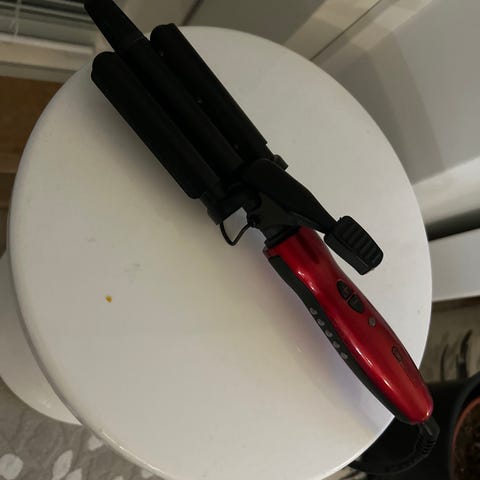 Myyntiin kerran kokeiltu ja omille lyhyille hiuksille liian isoksi todettu lainerauta. Lämmönsäädin.